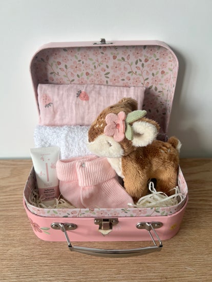 Leuke koffer van het merk Little Dutch met een leuke knuffel, new Born sokjes, hydrofiele doek, monddoekje, Naïf verzorgingsproduct.
